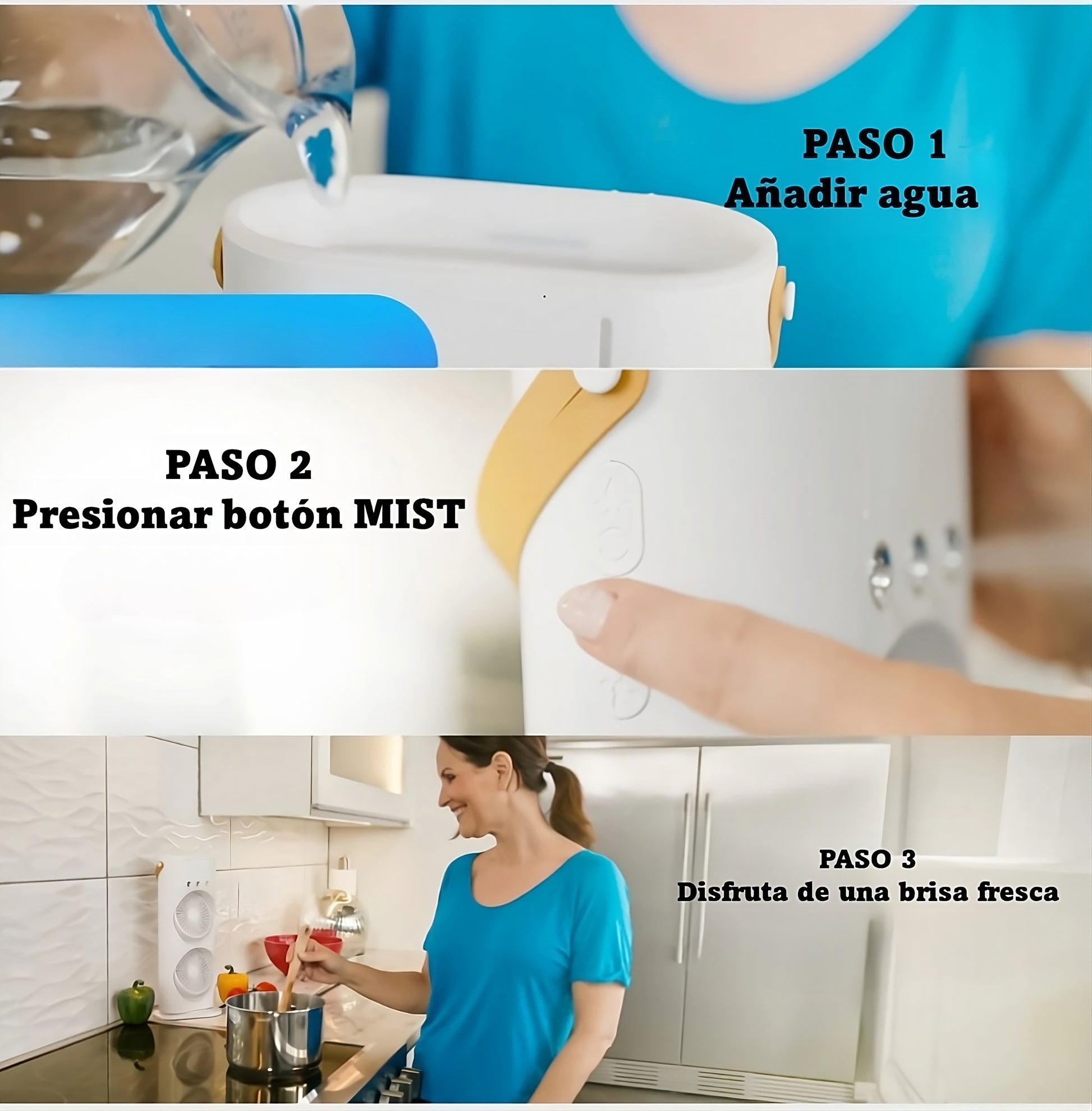 Convierte instantáneamente el aire caliente en una brisa refrescante, gracias a su tecnología de micro-neblina 🌿 Además, funciona como un potente ventilador que puedes llevar contigo a cualquier lugar